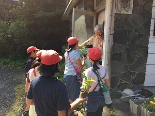【まずは、苗植えの時お手伝いいただいた「商工会女性部」「福寿会」の皆様へ花の贈呈を行いました。】