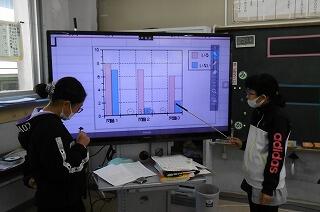 【全校児童・職員にとったアンケート結果を、タブレットを使って集計し、分かりやすくグラフに表す学習を行っていました。】