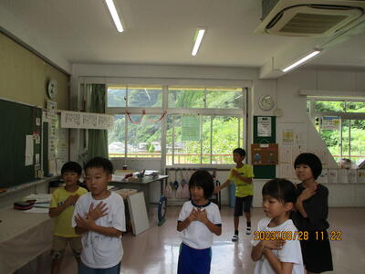 全校朝会では、校長先生から「平和」について考えるお話があり、8月6日(広島)8月9日(長崎)の原子爆弾投下、昭和20年8月15日の「終戦記念日」についての説明もありました。