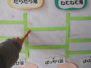 なまけ鬼を追い払うために、あみだくじで大豆までたどり着きアドバイスをもらいます
