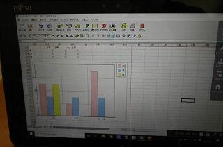 【4年国語:前回の続きです。アンケートの結果を集計してグラフ化したものを使い、発表していました。】