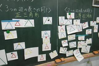 【前時に作ったいろいろな三角形を、正三角形、二等辺三角形に仲間分けしていきました。】