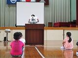校長先生のお話の後、交通指導員の方々がDVDを使ってわかりやすく自転車の安全な乗り方などを教えてくださいました。