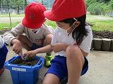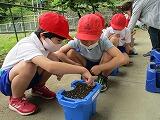 今日の朝のボランティアは、1つ1つ玉の肥料を入れて配付の準備をしました。