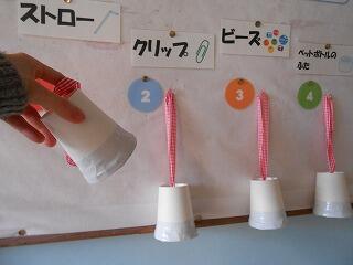 紙コップに何が入っているか、音を聞いて当てるゲームです