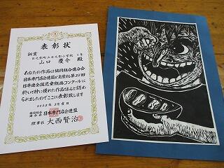 校長先生から表彰状とメダル、副賞をいただきみんなで記念撮影