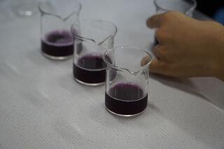 【紫キャベツの葉の汁に水溶液を加えると・・・あら不思議。さっと色が変化しました。これは赤色に変わったから酸性だ!】
