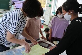 業前の時間、5・6年教室では紙すきが行われました。