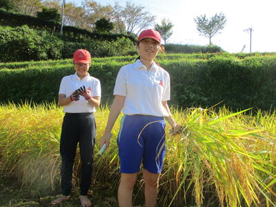秋晴れのもと、古園地区にお住まいの岩本尚格さんの田んぼをお借りして稲刈りをさせていただきました。