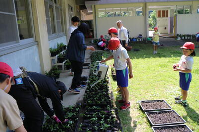 1ヶ月後、みんなで育てた花の苗を地域の方々に配付します。