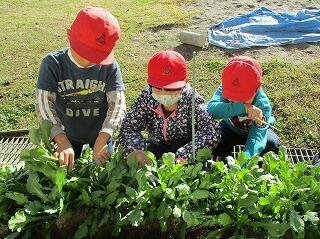 春菊のわき芽かぎと大根の間引きをした1・2年生。