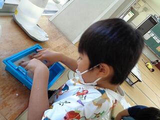 5日間ほど水につけておいたものの、1・2年生の指の力では、フィルムを剥がすのに一苦労・・・。