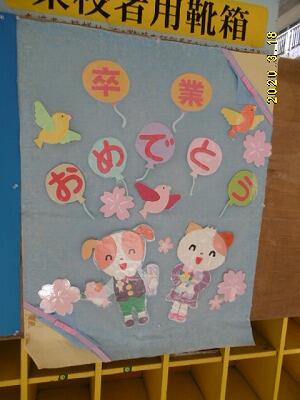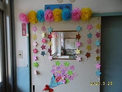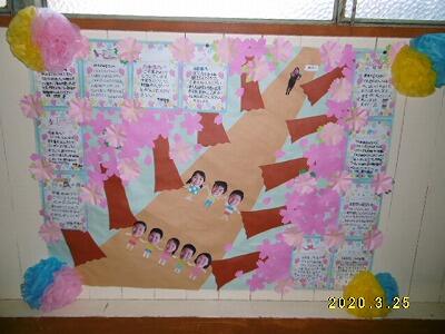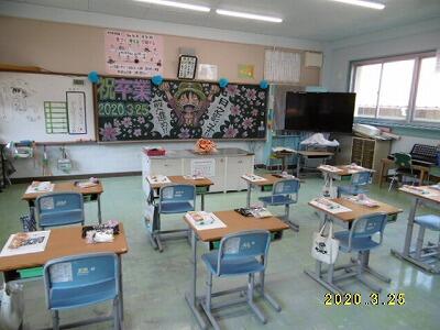 まずは、5・6年生教室に入ってビックリ!完成度の高い巨大黒板アートや臨時休業中に職員が作成した掲示物が卒業生を迎えました。