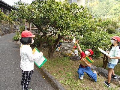 3・4年生「ゆず学習」。以前HPでも紹介した「白い花」を見つけて、感動の声を上げていました。