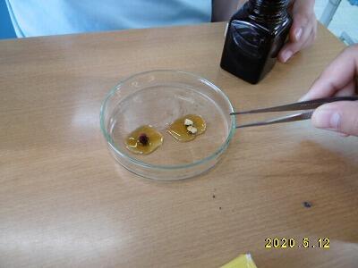 【種子を切り、ヨウ素液をつけてみると・・・。】