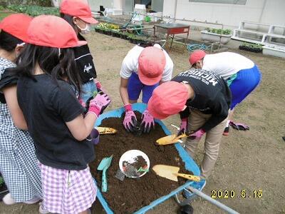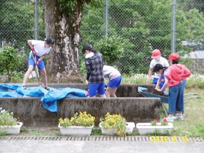 【土の準備-上級生は、朝のボランティアの時間から取りかかり始めました。】