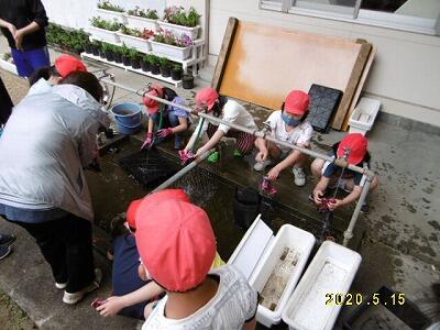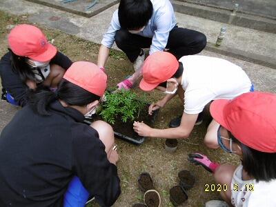 【根や葉を傷つけないように、ていねいにポットに植え替えていきました。】