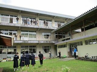 日之影小は、朝のボランティア活動が終わると、町内を流れる放送に合わせてみんなでラジオ体操をします。
