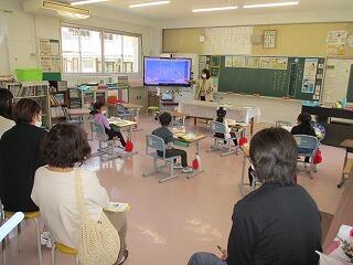 1時間目の始業式での校長先生のお話。「夢」「向上」「健康」の3つのキーワードを胸に、進級した喜びをかみしめた子どもたちです。