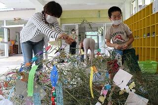 1・2年生が代表して笹竹に飾り付けをしてくれました。絵文字:笑顔