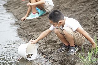 放流する前に、自分たちで川に入っていくカニもいました。絵文字:ニヤリ