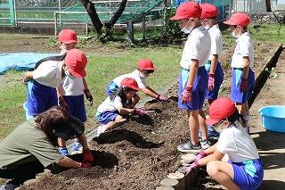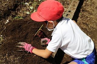 担任の先生のお手本をしっかり見て、いもほりを始めた1・2年生。