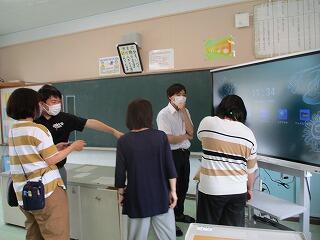 2コマ目は、学教さんに、電子黒板の使い方を中心に教えていただきました。知らない機能が盛りだくさん。先生方も興味津々。さすが、先生方。質問の嵐はなかなか収まりませんでした。