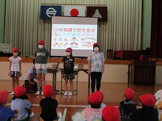 「分かったかな?」とお話の最後に校長先生が尋ねられると、オッケーサインを出す1・2年生。