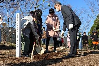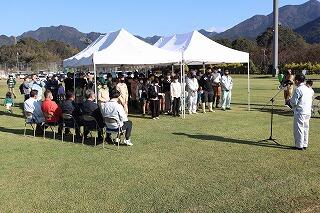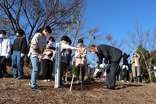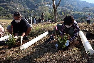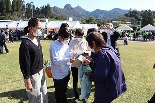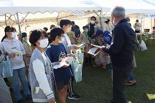その後は、渓谷祭り会場に移り、つつじの苗木200本を、作成したメッセージカードと一緒に配布しました。