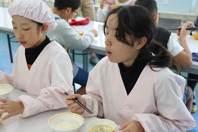 お米は、自分たちが稲作学習で収穫した「新米」を岩本さんから提供していただいたもので、感謝の気持ちをもって調理するとともに、おいしくいただきました。
