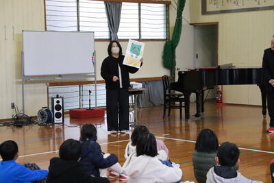 子ども達が選んだ「日之影小図書館のマスコットキャラクター」の紹介と多読賞、文集「友だち」「西日本読書感想画・感想文」の表彰がありました。