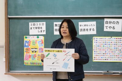 学習の7つ道具について自分の名前を書くこと、その他、戸髙先生が27年間愛用しているペンについて紹介がありました。