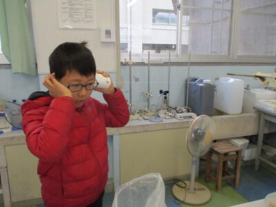 糸電話を作り実験しました。糸がふるえている様子や糸をつまむと音が聞こえなくなることを学習しました。