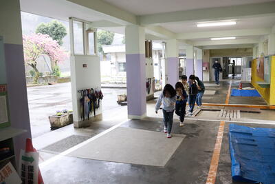 各学級で事前指導を行い、その後、天気の関係で体育館へ避難しました。