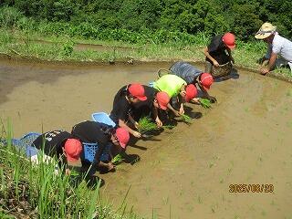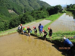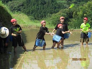 6月20日(金)、5・6年生は田植えをしました。今年も、下小原の若杉さんの水田をお借りして植えました。