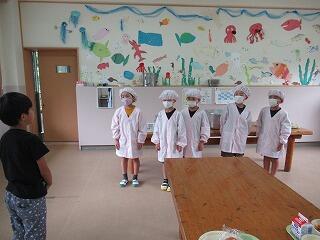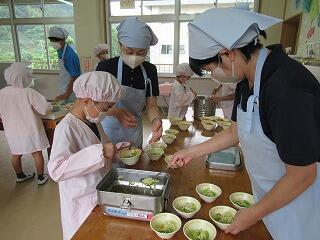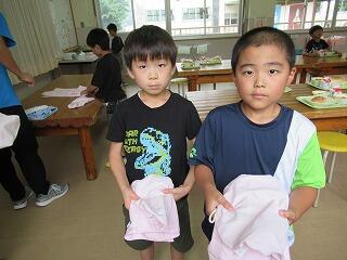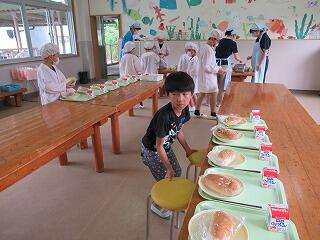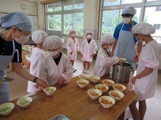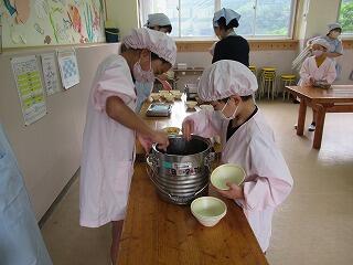 2年生は、給食の準備や片付けが上手になってきました。いつも5・6年生のお兄さん、お姉さんが2人、お手伝いに来てくれます。