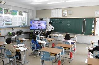 3年生は、社会の学習をしていました。大型テレビを使って、「火事からくらしを守る工夫」について学習していました。子どもたちの目が一点に集中しています。