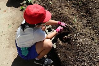 担任の先生のお手本をしっかり見て、いもほりを始めた1・2年生。