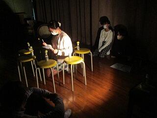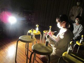 体育館のステージで、暗幕を引いて実験を行いました。