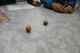 【どんぐりごまチームは?というと・・・。「誰が一番長く回っているか」勝負していました。】