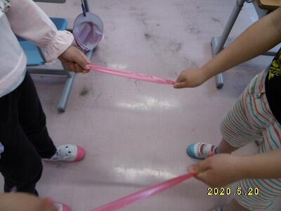 コロナウイルスの感染防止のため、手をつなぐことができないので、ひもを使って・・・。