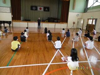 【体育館に移動し、不審者対応の合言葉「イカのおすし」の確認】