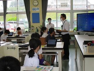 日之影小の子どもたちがいち早く作業を終え、他の学校の友達にタブレットの操作を教えている光景も見られました。