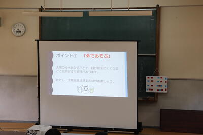 子ども達が「目を大切にする行動について」考える大事な時間になりました。月目標を意識しながら生活できるとよいです。