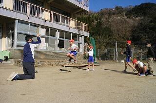 上級生と下級生がペアになり、45度に投げる角度を体感します。