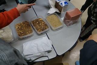 牛の飼料について、実際に見て、触らせていただきました。脱脂粉乳や配合飼料、塩のかたまりなど、味も体験しました。