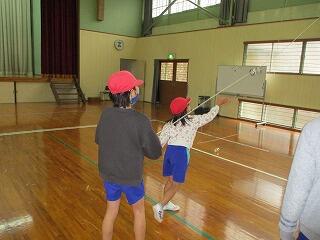 ダブルダッチにチャレンジ中の3・4年生の姿がありました。にっこり了解