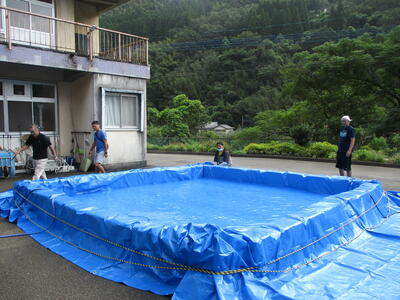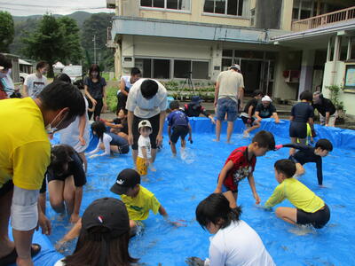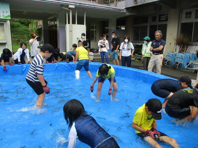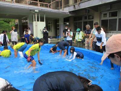 夏休み、旧小原小学校周辺の川で企画していた「ニジマスのつかみ取り」を台風の影響により川から学校に場所を変更して、9月2日(土)実施しました。