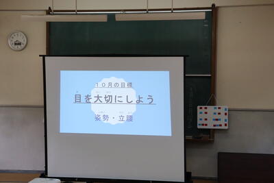 9月を振り返り、運動会では一人一人がよくがんばり、地域の方々にも喜んでいただいた。10月は「学校と地域をつなぐ音楽祭」に向け、みんなでがんばりましょう!とお話がありました。また、「自分の目標」をもって日々過ごすことの大切さについてもお話がありました。