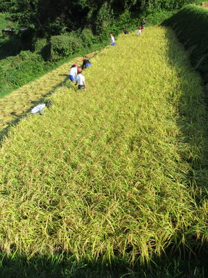秋晴れのもと、古園地区にお住まいの岩本尚格さんの田んぼをお借りして稲刈りをさせていただきました。